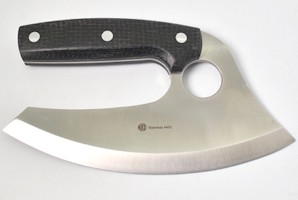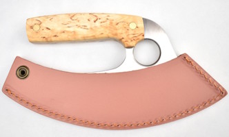 ウルナイフと似て非なるもの、ラウンドナイフ( Round Knife )ヘッドナイフ( Head Knife )こちらは革製品の裁断に特化したナイフ。 革を押し切る為の形状、ハンドルが縦に長いのが特徴の様です。使い方によってはウルナイフやメッツァルーナ的な用途にも…