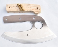 ■各国のミンシングナイフ、メッツァルーナナイフ(メッザルーナ)、ヴィゲメッサー(ヴィーゲ、ヴィギ) ↑TOPへ戻る ミンシングナイフ( Mincing Knife : 切刻みナイフ )メッツァルーナナイフ( Mezzaluna Knife : 半月ナイフ )ヴィゲメッサー( Wiegemesser : 揺り籠ナイフ ) などと呼ばれる切刻み用のナイフもあります。こちらはウルナイフよりインドアナイフ(キッチン用品)感が強くシースはほぼ付属しません、錆に強いステンレスが 中心で刃厚も薄く純粋に調理道具な感じがします。 ルーツ的には1706年に Silvio Pacitti 氏によって発案されピザカッターとして使用されていたのが最初のメッツァルーナという説や、紀元前の古代エジプトで 使われていたマフラタ/マハラタが起源でその後ヨーロッパに伝わったなど諸説あるようです。 日本的感覚からすると、「みじん切り?普通の包丁で出来るっしょ。」と思われるかも知れませんが欧米ではそれなりのポジションを得ており 伝統なのか?合理性なのか?粋なのか?よく分かりませんけど日本の刃物メーカーも欧米向けだけに作ってる事からその市場規模が窺えます。 メッツァルーナといえばイタリアというイメージがありますが、フランスやドイツを始め欧州各国、北米・南米、中東に至るまで意外と多くの国々で 使われており、その名称も様々で言語の違いも然る事ながら形、動作、用途などそれぞれの捉え方から名付けられたりしています。 上記三つの呼び方の他には単にメッツァルーナ( Mezzaluna )や、メッツァルーナチョッパー( Mezzaluna Chopper )ハーブチョッパー( Herb Chopper ) ハーブカッター( Herb Cutter )チョッピングナイフ( Chopping Knife )ロッキングナイフ( Rocking Knife )アショワーベルスーズ( Hachoir Berceuse ) ヴィゲメス( Wiegemes )ハーケキニィヴ( Hakkekniv )ヴォーゲキニィヴ( Vuggekniv )コルテッロメッツァルーナ( Coltello Mezzaluna ) クチージョメディアルーナ( Cuchillo Medialuna )ファカメイアルーア( Faca Meia Lua )マフラタ/マハラタ( - アラビア語 - )等々、色々な呼ばれ方が ありますがほぼ同じ物を指しているのでしょう。(発音が微妙なのはご容赦下さい…) Mezzaluna は本来イタリア語(半月の意)ですが既に代名詞の様な存在になっており、伊/英折衷で Mezzaluna Knife などと呼ばれています、あえて英語で 言うなら Halfmoon Knife となるのでしょうか?まあ日本の三徳包丁が海外で Santoku Knife と呼ばれ親しまれている様な感じだと思われます。 大別すると形状がウルナイフに似ている片手で使う物と、切刻みに特化した両手で持って使う物の2種類に分かれ、それぞれ一枚刃、ニ枚刃などあります。 又、アンティークでは昔のソーセージ工場などで使用された二人掛りで使う複数枚の刃が付いた巨大な物や、歯車チェーンで構成されたミンシングマシーン みたいなのもあったそうな。ここではウルナイフ風な片手タイプで一枚ブレードの物を中心に紹介していこうかと思います。